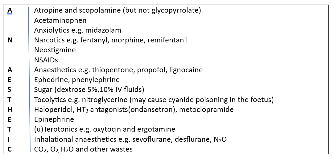Any chemical with a molecular weight less than 500 Da, lipid soluble and non-ionised can cross the placenta easily. Many anaesthetic drugs used during RA, GA or even sedation easily cross placenta. In general, drugs which cross the blood brain barrier will cross the placental barrier as well. Drugs used during general anaesthetics which cross the placental barrier are outlined in table-2.
