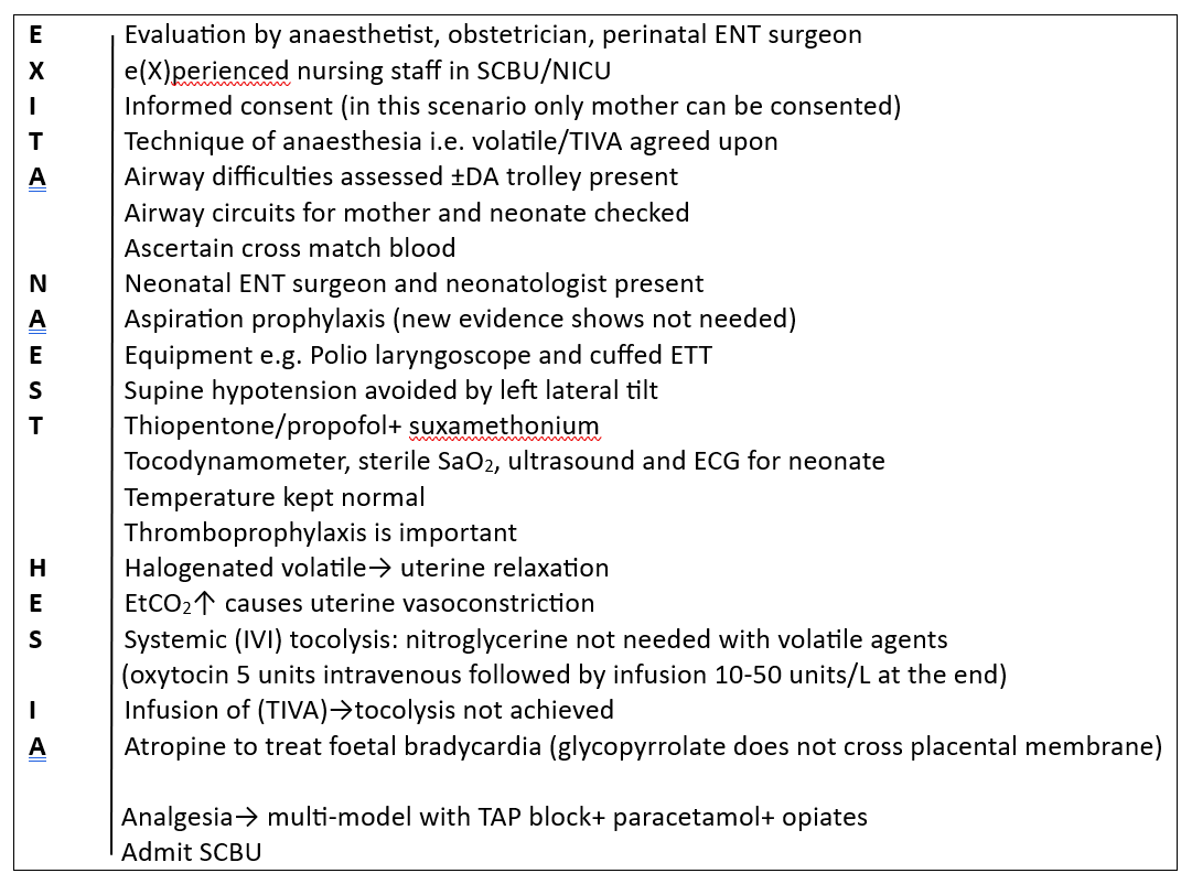 Traditionally, general anaesthesia (GA) has been the technique of choice for EXIT procedures due to the ease of titration of inhalational agents to achieve satisfactory uterine relaxation and to provide foetal anaesthesia. However, several reports have described neuraxial anaesthesia use in combination with tocolytics to achieve satisfactory operating conditions for EXIT procedure. The tasks and aims of anaesthetist are outlined as: