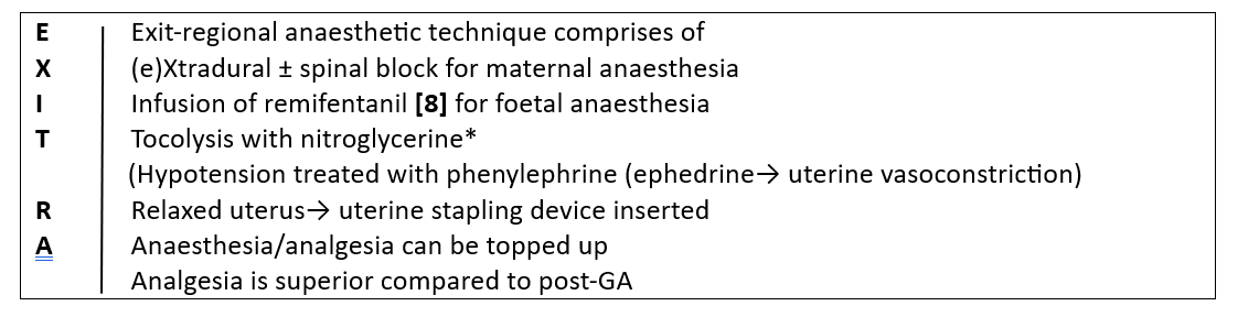 From the above description, it is obvious that the goals of exit-anaesthesia are maternal anaesthesia, foetal anaesthesia and tocolysis. Regional technique achieves maternal anaesthesia only; TIVA will give maternal as well as foetal anaesthesia, whilst volatile GA will provide all three components of exit-anaesthesia.