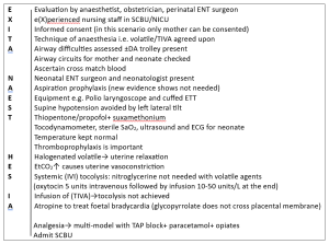 Neuraxial techniques require additional IV nitroglycerine for uterine relaxation that can lead to problematic hypotension and uterine hypoperfusion. It is anticipated that the patients managed with RA+nitroglycerine will need more vasoconstrictors in the form of metaraminol or phenylephrine. Nevertheless, vasopressors are also needed while these patients are managed with general anaesthesia. EXIT procedure for the management of congenital diaphragmatic hernias is now infrequently performed due to alternative foetoscopic techniques. Foetal airway surgery management remains the main indication for EXIT procedure. Overall mortality in one study was 24% whilst the EXIT interventions themselves had low immediate ‘procedure-specific’ mortality (4%). This suggests that subsequent mortality is related to other perinatal factors. Recent developments also include use of 3D modelling for simulation and MDT training before embarking on the procedure.